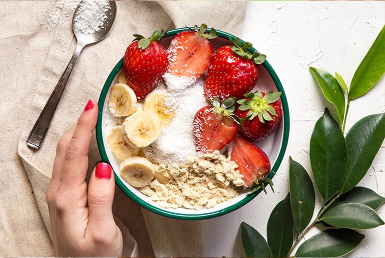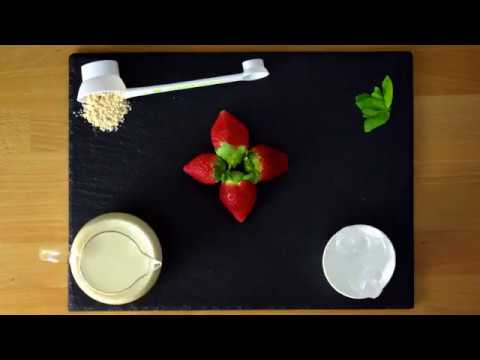 Frullare per 30 secondi la Formula 1 Fragola Delight in polvere e il latte di mandorle e servire in una scodella. Guarnire con fragole, banana e avena!